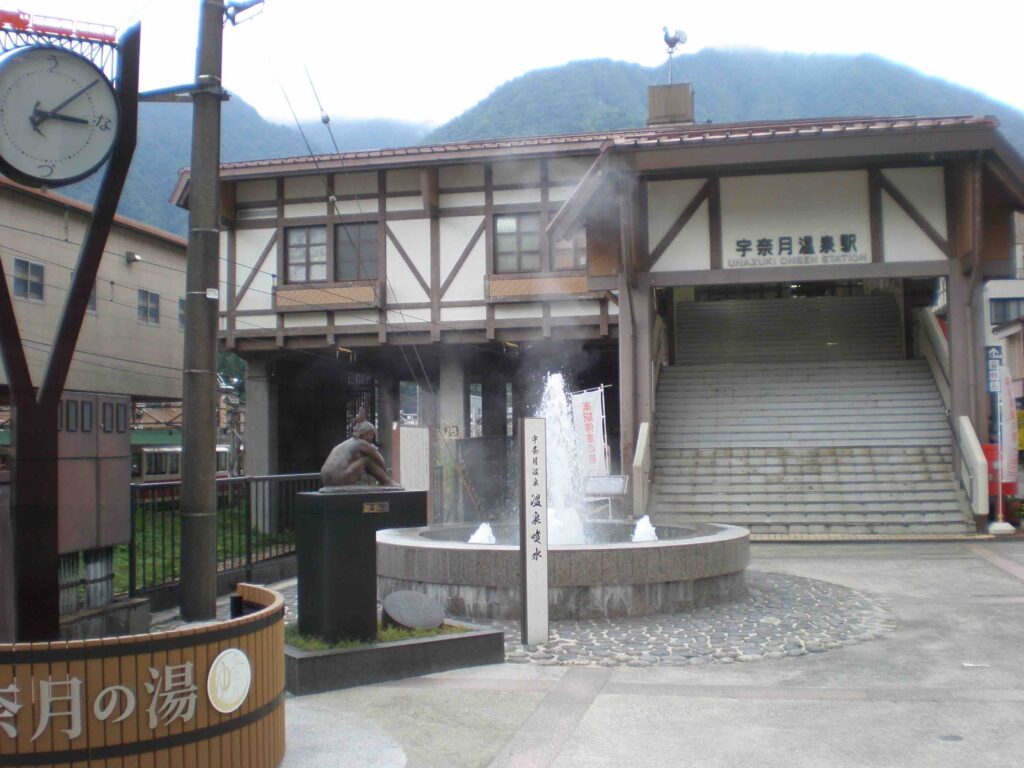 宇奈月温泉駅改札と駅舎 この姿になったのは2018年、駅前広場の温泉噴水はちょうどよい熱さです。手前の風呂桶は記念写真用スポットになっています。