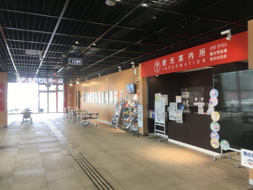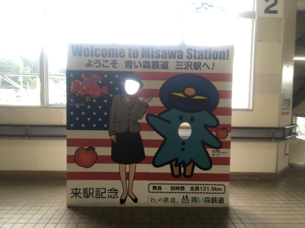 さて、三沢駅に到着です。駅も2020年に新しくなり、「駅前交流プラザみ~くる」「観光案内所」そして「駅そば」が入っています。そしてここにもイメージキャラクター「モーリー」がいます。三沢はご存知のとおり三沢基地があるので、少し米軍色があります。