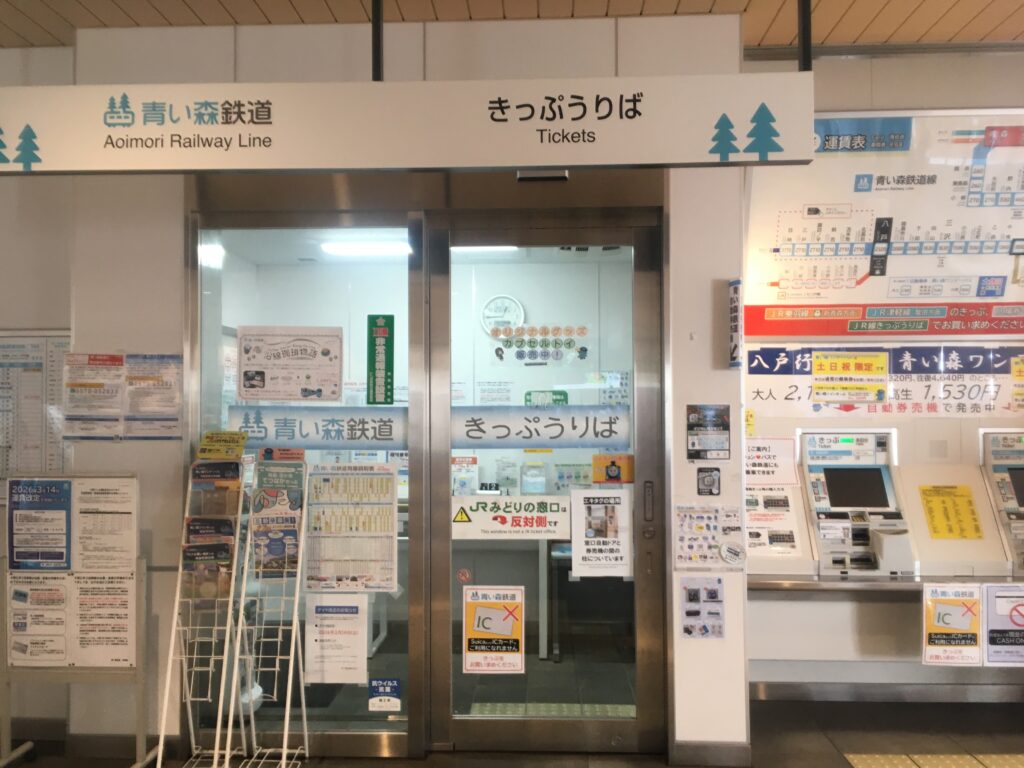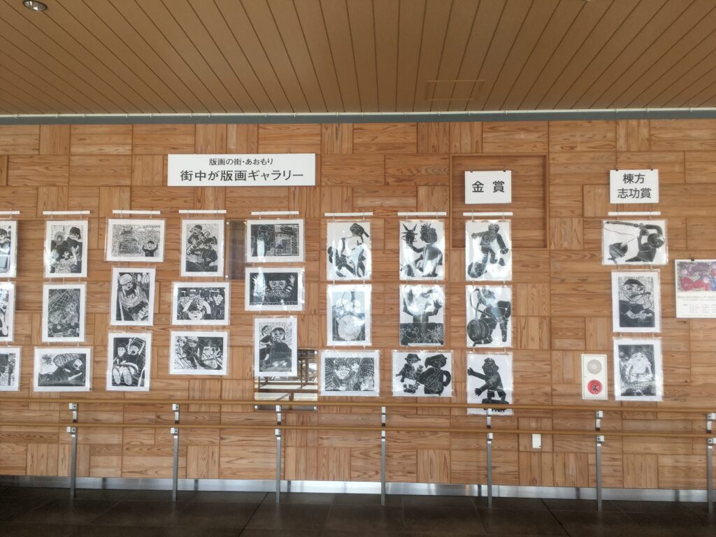 LOVINAや複合ビルのある東口、シンプルな西口と東西自由通路。通路にはおしゃれなりんご箱風のイスや版画ギャラリーがありました。青い森鉄道のきっぷうりばも東西通路東よりにあります。